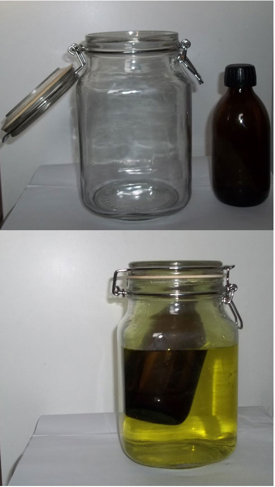 V láhvi PET pro hotový koncentrát je 1/2 l destilované vody do které se při reakci vstřebává plyn oxyd chloričitý. Z láhve pro hotový koncentrát s destilovanou vodou, vymáčkneme částečně vzduch a láhev s hadičkou ve víčku těsně uzavřeme.